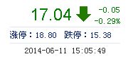 今開: 16.97 成交量: 15.73萬手 振幅: 2.98% 最高: 17.26 成交額: 2.68億元 換手率: 1.65% 最低: 16.75 總市值: 179.86億 市凈率: 4.88 昨收: 17.09 流通市值...