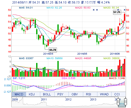 今開: 54.31 成交量: 10.55萬手 振幅: 5.80% 最高: 57.25 成交額: 5.88億元 換手率: 3.66% 最低: 54.10 總市值: 168.48億 市凈率: 10.14 昨收: 54.30 流通市...