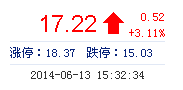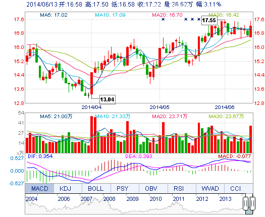 今開: 16.58 成交量: 36.62萬(wàn)手 振幅: 5.51% 最高: 17.50 成交額: 6.32億元 換手率: 3.83% 最低: 16.58 總市值: 181.76億 市凈率: 4.93 昨收: 16.70 流通市值...