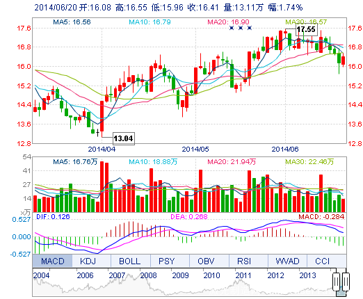 | 今 開: | 16.08 | 成交量: | 13.11萬手 | 振 幅: | 3.66% |