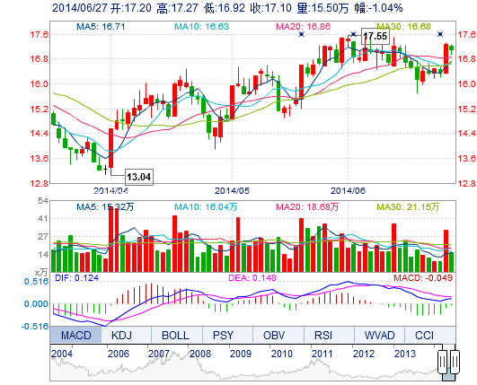 | 今 開: | 17.20 | 成交量: | 15.50萬(wàn)手 | 振 幅: | 2.03% |