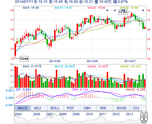 今開: 16.10 成交量: 19.45萬手 振幅: 2.49% 最高: 16.48 成交額: 3.17億元 換手率: 2.03% 最低: 16.08 總市值: 171.32億 市凈率: 4.65 昨收: 16.09 流通市值...