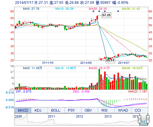 | 今 開: | 27.31 | 成交量: | 9.10萬(wàn)手 | 振 幅: | 2.82% |