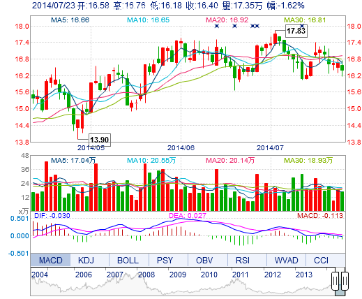 今開: 16.58 成交量: 17.35萬(wàn)手 振幅: 3.48% 最高: 16.76 成交額: 2.86億元 換手率: 1.81% 最低: 16.18 總市值: 173.11億 市凈率: 4.70 昨收: 16.67 流通市值...