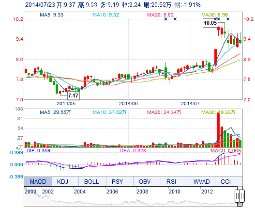 今開(kāi): 9.37 成交量: 20.52萬(wàn)手 振幅: 5.20% 最高: 9.68 成交額: 1.93億元 換手率: 4.70% 最低: 9.19 總市值: 40.36億 市凈率: 2.90 昨收: 9.42 流通市值: 40...