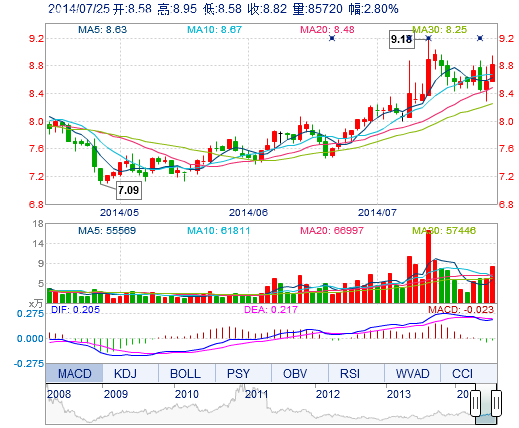 今開: 8.58 成交量: 8.57萬(wàn)手 振幅: 4.31% 最高: 8.95 成交額: 7553.20萬(wàn)元 換手率: 3.12% 最低: 8.58 總市值: 25.14億 市凈率: 3.92 昨收: 8.58 流通市值: ...