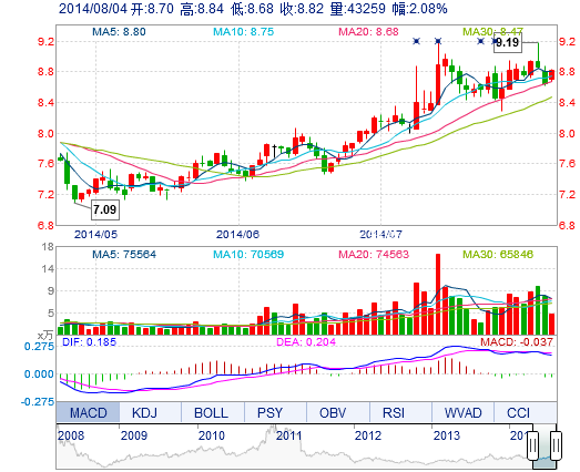 今開: 8.70 成交量: 4.33萬手 振幅: 1.85% 最高: 8.84 成交額: 3797.40萬元 換手率: 1.57% 最低: 8.68 總市值: 25.14億 市凈率: 3.92 昨收: 8.64 流通市值: ...