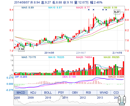 今開: 8.94 成交量: 12.67萬手 振幅: 4.36% 最高: 9.27 成交額: 1.15億元 換手率: 4.61% 最低: 8.88 總市值: 26.11億 市凈率: 4.07 昨收: 8.94 流通市值: 25...