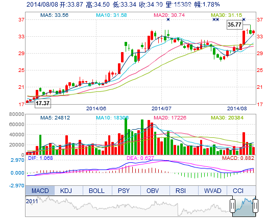 | 今 開: | 33.87 | 成交量: | 1.54萬手 | 振 幅: | 3.44% |