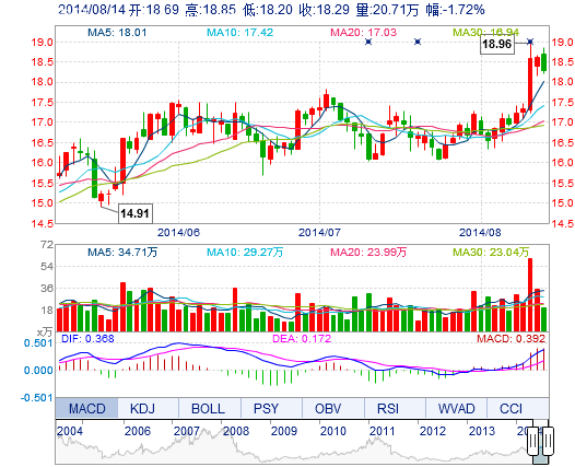 | 最 高: | 18.85 | 成交額: | 3.83億元 | 換手率: | 2.17% |