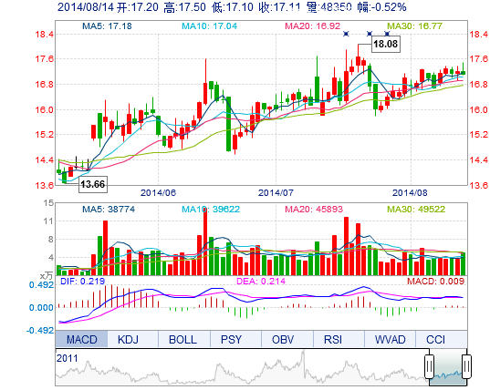 | 今 開: | 17.20 | 成交量: | 4.83萬(wàn)手 | 振 幅: | 2.33% |