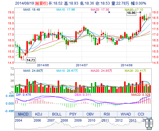 今開(kāi): 18.52 成交量: 22.78萬(wàn)手 振幅: 3.08% 最高: 18.93 成交額: 4.25億元 換手率: 2.38% 最低: 18.36 總市值: 195.60億 市凈率: 5.31 昨收: 18.53 流通市值...
