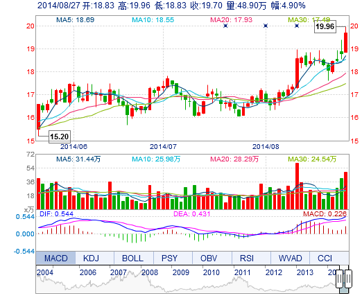 今開: 18.83 成交量: 48.90萬手 振幅: 6.02% 最高: 19.96 成交額: 9.59億元 換手率: 5.11% 最低: 18.83 總市值: 207.99億 市凈率: 5.65 昨收: 18.78 流通市值...