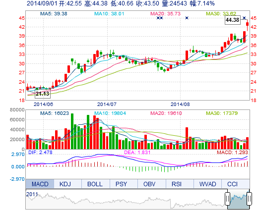 | 最 低: | 40.66 | 總市值: | 30.45億 | 市凈率: | 10.36 |