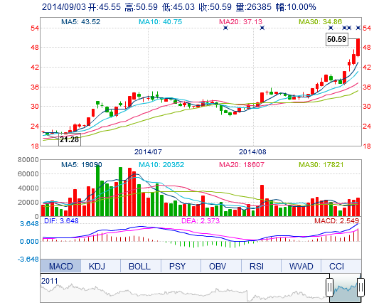 今開: 45.55 成交量: 2.64萬手 振幅: 12.09% 最高: 50.59 成交額: 1.29億元 換手率: 7.28% 最低: 45.03 總市值: 35.41億 市凈率: 12.05 昨收: 45.99 流通市值...