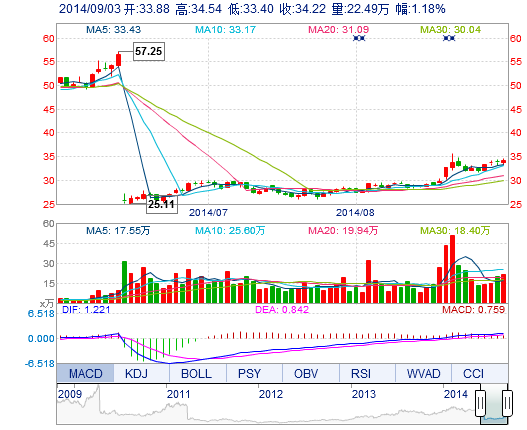 今開: 33.88 成交量: 22.49萬手 振幅: 3.37% 最高: 34.54 成交額: 7.64億元 換手率: 3.55% 最低: 33.40 總市值: 224.09億 市凈率: 13.18 昨收: 33.82 流通市...