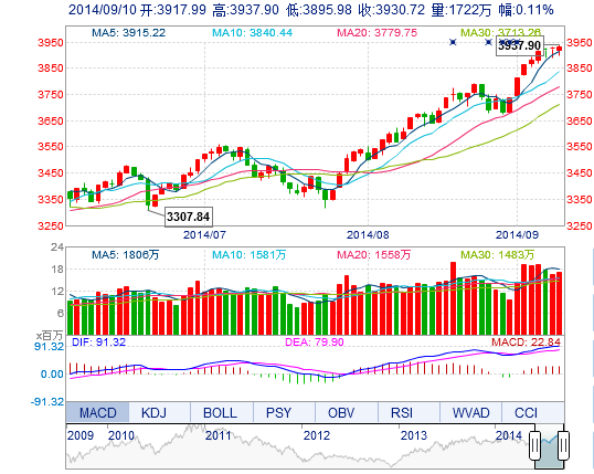 今開: 3917.99 最高: 3937.90 昨收: 3926.35 最低: 3895.98 成交量: 1721.74萬手 振幅: 1.07% 成交額: 295.04億元