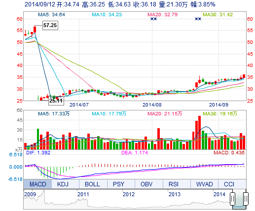 今開: 34.74 成交量: 21.30萬手 振幅: 4.65% 最高: 36.25 成交額: 7.55億元 換手率: 3.36% 最低: 34.63 總市值: 236.93億 市凈率: 13.94 昨收: 34.84 流通市...