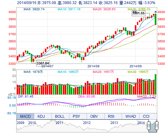 今開: 3975.08 最高: 3980.32 昨收: 3969.27 最低: 3823.14 成交量: 2442.35萬手 振幅: 3.96% 成交額: 356.83億元
