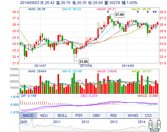 今開: 26.42 成交量: 3.03萬手 振幅: 1.51% 最高: 26.75 成交額: 8052.22萬元 換手率: 0.58% 最低: 26.35 總市值: 174.41億 市凈率: 9.59 昨收: 26.42 流通市...