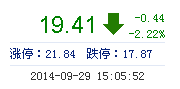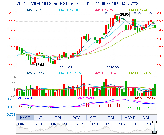 今開: 19.68 成交量: 34.19萬手 振幅: 2.62% 最高: 19.81 成交額: 6.66億元 換手率: 3.58% 最低: 19.29 總市值: 204.92億 市凈率: 5.56 昨收: 19.85 流通市值...