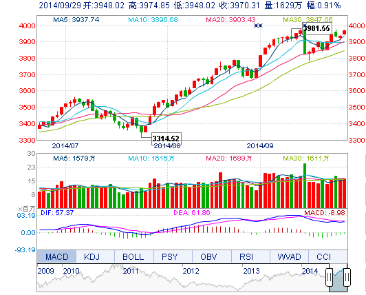 今開: 3948.02 最高: 3974.85 昨收: 3934.47 最低: 3948.02 成交量: 1628.77萬手 振幅: 0.68% 成交額: 272.93億元