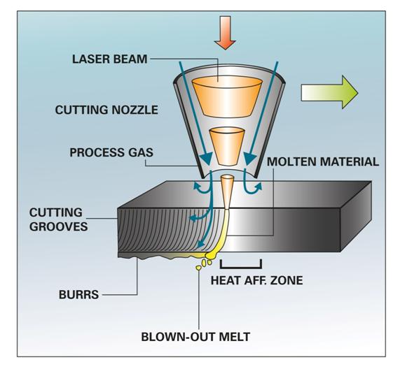 說明:用激光束切割脆性材料時,材料會在相互作用區(qū)域內(nèi)熔化,需借助工藝氣體從切邊移除。