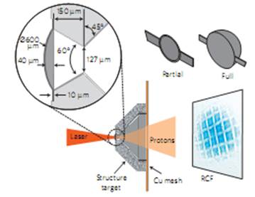 圖10 實驗設(shè)置和目標(biāo)靶。錐靶由10微米厚的球殼層和鋁錐體組成,銅網(wǎng)格和成像板分別