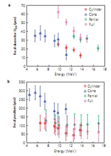 圖11 橫軸為質(zhì)子能量,a中縱軸為焦斑直徑,b為焦點位置