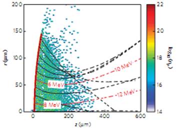 圖12 測試質(zhì)子的模擬結(jié)果。曲線為質(zhì)子的運動軌跡,顏色反映質(zhì)子的密度