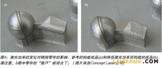 在許多案例中,設(shè)備供應(yīng)商正在開發(fā)結(jié)合了成像和發(fā)射傳感的復(fù)合傳感器。圖3簡(jiǎn)要地顯示了Concept Laser公司是如何在其QMmeltpool模塊中實(shí)現(xiàn)該方案的。具有1×1mm2觀測(cè)區(qū)(高的空間分辨率)的同軸可見光相機(jī)獲取圖像的幀率高達(dá)每秒4000幀。如果需要的話,光電二極管信號(hào)甚至可以提供更高頻率的信息。為了應(yīng)對(duì)潮水般涌來的數(shù)據(jù),每一整個(gè)分層的信息被合并在一起并存儲(chǔ),而不是存儲(chǔ)每一層內(nèi)所有的單個(gè)點(diǎn)的信息。根據(jù)Bechmann所說,相機(jī)可以拍攝“非常詳細(xì)的圖片”,可以檢測(cè)由于透鏡污染或激光器老化所引起的低能量熔池的情況,以及粉末計(jì)量因素的偏差。圖4顯示了降低激光功率對(duì)零件造成的差異,包括較小的“窗戶”。