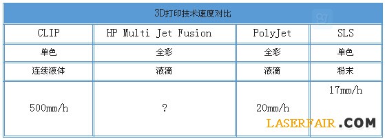 Multi Jet Fusion的噴頭陣列就是大大提高速度的秘密。并且,“10倍速”這個數(shù)據(jù)在惠普實驗室中通過與SLS和FDM技術(shù)的測試對比,已經(jīng)被驗證。那么25-100倍速的CLIP,是不是遠遠快于惠普的Multi Jet Fusion技術(shù)呢?我們看這個表格。