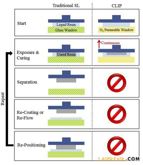 傳統(tǒng)光固化技術(shù)與CLIP的差距就在于停頓和重啟的過程而CLIP是連續(xù)打印的