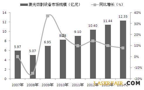 據(jù)相關(guān)數(shù)據(jù)顯示,2008-2014年,我國(guó)激光切割設(shè)備規(guī)模保持穩(wěn)步增長(zhǎng)。2008年,我國(guó)激光切割設(shè)備市場(chǎng)規(guī)模僅為5.07億元,到2012年增長(zhǎng)超過(guò)100%。2014年,我國(guó)激光切割設(shè)備市場(chǎng)規(guī)模為12.35億元,同比增長(zhǎng)率為8%。