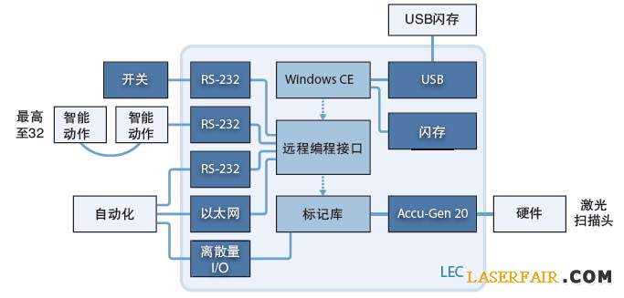 內置的遠程API功能還能讓制造商通過使用電腦、PLC或是其他連接設備來控制LEC。借助此功能,系統(tǒng)集成商設計的激光打標設備可以讓工廠的工程師遠程接入這些設備,同時還能以各種方式來操縱和控制數(shù)據(jù),包括TCP/IP協(xié)議以及通過網絡中的電腦、PLC或者智能手機/平板電腦發(fā)出的串口命令。