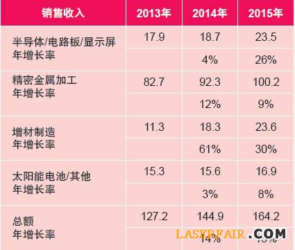 表4將微加工分為三個大的分類以及雜項,從表中我們能看到半導體工業(yè)(一個典型的周期性行業(yè))的設備訂單下滑帶來的影響。再加上精密金屬加工這個主要行業(yè)的不確定性,導致2014年的銷售收入下降了2%。不過積極的一面是,3D打印技術煥發(fā)出極大的活力,引起了持續(xù)而廣泛的關注。這提高了眾多工業(yè)對增材制造(用高功率激光直接金屬沉積技術來制造零部件)的接受度。最終在這一領域的激光器銷售收入增加了34%,并且在2015年還會有更大的增長潛力,預期增長率將達到62%。