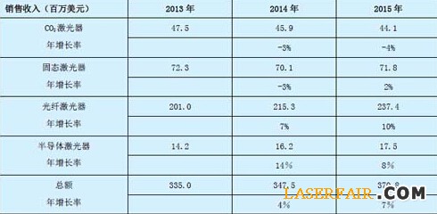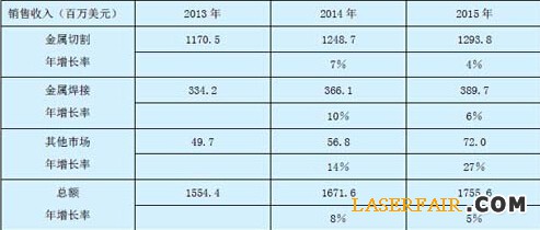 表1:所有的工業(yè)激光材料加工市場(chǎng)的銷售收入(貨幣單位:百萬(wàn)美元)