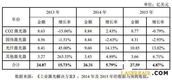 由上表可知,2014 年全球激光器的銷售收入增長了 5.79%,其中光纖激光器銷售收入增長率達(dá)到了 14.15%,成為增長最快的激光器品種。