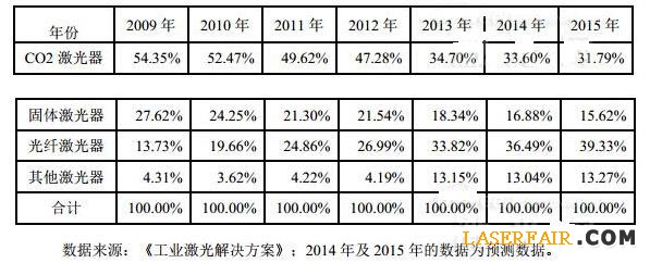 2009 年至 2015 年各種類型的激光器銷售占全球激光器市場銷售收入的比例如下所示: