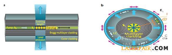 Stolyarov等人在Nature Photonics上的文章報(bào)道了此方面研究的重要進(jìn)展:利用布拉格光纖獲得了各向同性的激光。在中空纖芯內(nèi)填入的有機(jī)染料(若丹明590)摻雜的增益介質(zhì)為角向各向同性。染料分子的快速重定位使增益介質(zhì)對(duì)泵浦光的偏振不敏感,激光具有嚴(yán)格的柱狀波前且沿幅角方向有精確的偏振。此外,研究者在光纖包層中引入軸向液晶微通道陣列對(duì)輻射方向進(jìn)行精確控制。有趣的是,沿光纖長(zhǎng)度方向可移動(dòng)增益介質(zhì)到任何位置,這使得其具有很多潛在應(yīng)用。