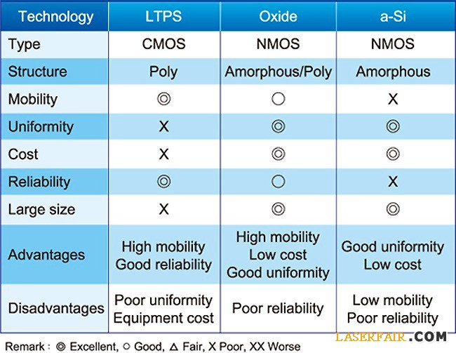 常見(jiàn)的氧化物半導(dǎo)體如氧化銦鎵鋅(InGaZnO),是一種電子移動(dòng)率可達(dá)10平方厘米(cm2)/VS的新材料,為傳統(tǒng)非晶矽(<1cm2/VS)的數(shù)十倍以上。加上非晶(Amorphous)結(jié)構(gòu)可以在大尺寸獲得良好的均勻度,適合應(yīng)用在大尺寸面板,達(dá)到高清晰度、低能耗、低漏電的優(yōu)點(diǎn),但其可靠度不??佳以及PMOS制造工藝?yán)щy一直是亟待改善的技術(shù),前者是量產(chǎn)商品化必須克服的重要關(guān)鍵,后者可用補(bǔ)償電路(Compensation Circuit)加以克服。