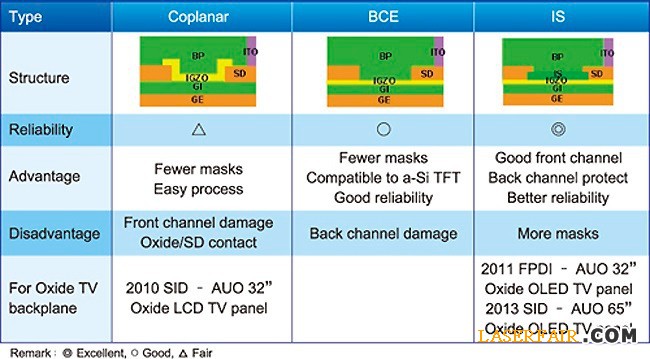 常見(jiàn)的氧化物薄膜晶體管元件結(jié)構(gòu)主要有共平面(Coplanar)、蝕刻阻障層(Island Stop/Etch Stop Layer,IS/ESL)和背通道蝕刻(Back Channel Etch,BCE)這三種。共平面結(jié)構(gòu)制程簡(jiǎn)單,但因?yàn)檠趸锇雽?dǎo)體層要攀爬源汲極金屬,容易導(dǎo)致電特性與接觸問(wèn)題,且可靠度不??佳。至于背通道蝕刻和蝕刻阻障層結(jié)構(gòu)在元件特性及制程良品率上則較具優(yōu)勢(shì),尤其是背通道蝕刻結(jié)構(gòu)相容于標(biāo)準(zhǔn)非晶矽結(jié)構(gòu),極具競(jìng)爭(zhēng)力。但若考量可靠度,則以蝕刻阻障層結(jié)構(gòu)最為理想,原因主要在于蝕刻阻擋層可保護(hù)元件的背通道,不受制程影響產(chǎn)生特性??差異,但缺點(diǎn)是復(fù)雜的制程導(dǎo)致成品與良品率問(wèn)題。