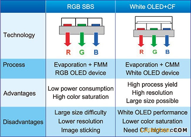 常見(jiàn)全彩OLED技術(shù)主要包含紅、綠、藍(lán)像素并置法(RGB-SBS,Side-By-Side)以及白光OLED+彩色濾光片(White OLED+Color Filter)技術(shù)。紅、綠、藍(lán)像素并置法由紅、綠、藍(lán)像素分別發(fā)光所組成,不僅能獲得較佳的色彩飽和度,還能省電,但大尺寸蒸鍍(Evaporation)不易,需要持續(xù)開(kāi)發(fā)。