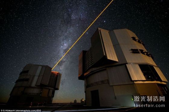智利歐洲南方天文臺(tái)帕拉納爾天文臺(tái)操作的這個(gè)新PARLA激光器。從圖上可以看到,7瓦特激光器發(fā)出的橙黃色光束從甚大望遠(yuǎn)鏡的望遠(yuǎn)