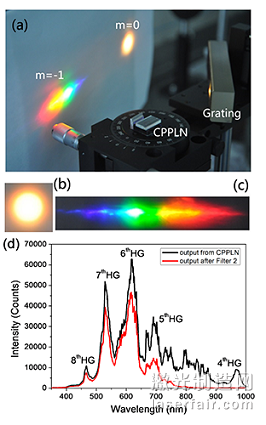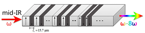 然而,要在單塊非線性晶體中實現(xiàn)更高次諧波的產(chǎn)生卻是一個難以攻克的關(guān)卡,這是由于在高次諧波實現(xiàn)的過程中涉及的非線性上轉(zhuǎn)換過程很多,而單塊晶體所能提供的倒格矢很難同時對這些過程中的相位失配進行補償。在世界范圍內(nèi),為了實現(xiàn)高轉(zhuǎn)換效率的高次諧波產(chǎn)生,只能利用多塊非線性晶體級聯(lián)使用,同時需要精細(xì)地控制每塊晶體的相位匹配條件,以獲得盡可能高的轉(zhuǎn)換效率。自非線性光學(xué)誕生50年以來,還沒有在單塊晶體中獲得高效的高次諧波產(chǎn)生。最近,該研究組利用原創(chuàng)性的科學(xué)思路和技術(shù)方案,在這一重要的科學(xué)難題上獲得了突破性的研究進展。該課題組利用啁啾結(jié)構(gòu)非線性光子晶體具有寬帶倒格矢分布的特點,首次實現(xiàn)寬帶超連續(xù)高次諧波的產(chǎn)生,在單塊晶體中實現(xiàn)了二到八次諧波的同時產(chǎn)生。