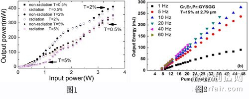 圖1 100 Mrad γ射線輻照前后Yb,Er,Ho:GYSGG的激光輸出功率曲線; 圖2 Cr,Er,Pr:GYSGG晶體在1~60Hz重復(fù)頻率下的激光特性曲線