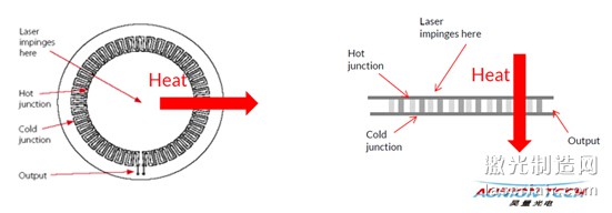 傳統(tǒng)的圓盤式熱電堆激光功率探頭由幾十個熱電偶串聯起來,體積相對比較大,整個熱電堆固定在環(huán)形云母架上,通過測量兩端電勢差來反映激光功率的大小。當激光光源照射在熱電堆探測器靶心時,產生熱量,熱量通過探測器轉換為電勢由中心沿著無源區(qū)向邊緣擴散,在熱電偶的熱端和冷端形成電勢差,最終由電壓計讀出。