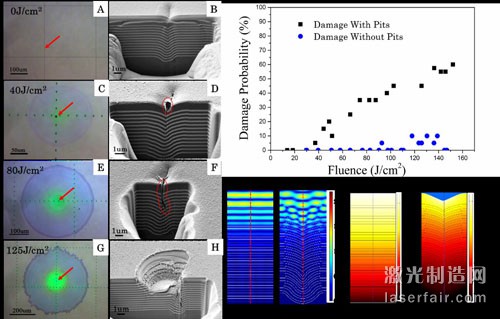 上海光機(jī)所中科院強(qiáng)激光材料重點(diǎn)實(shí)驗(yàn)室借助飛秒激光微加工平臺(tái)在石英基底上制作了特定大小的坑點(diǎn)缺陷(長(zhǎng)度:~7um,寬度:~3um,深度:~1um)。對(duì)沉積在有飛秒激光加工坑點(diǎn)和常規(guī)基底上的減反射膜和高反射膜的激光誘導(dǎo)損傷行為進(jìn)行了研究與對(duì)比分析。