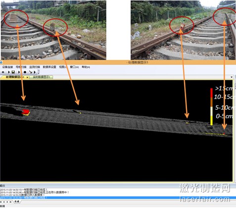 希德電子通過提高脈沖激光光源的準(zhǔn)直度,在不降低分辨率的前提下,將原有的20米半徑的探測范圍增加到半徑30米以上。并采用了點云、圖像和視頻三位一體逆向重建技術(shù)來獲得曲面重建之后的三維圖像,成像算法可以自動識別鐵軌做高亮處理并做為參考平面,自動識別新增異物并標(biāo)注與鐵軌平面的高度差,提供可靠的告警依據(jù)。