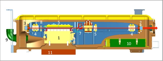 圖4 HOMER GEDI激光器橫截面圖,編號(hào)器件:(1)激光頭(2)GRM(3)HR鏡(4)里斯利對(duì)(5)1/4波片(6)Q開關(guān)(7)TFP(8)柱面透鏡(9)電氣連接(10)Q開關(guān)驅(qū)動(dòng)器(11)導(dǎo)熱接口。